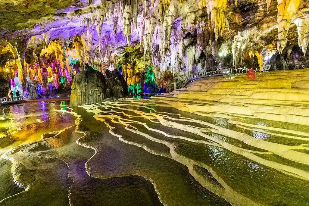- 核心特色:洞內(nèi)分四層結(jié)構(gòu),已開放第二層約2公里游覽線,包含五大主題廳——吉星迎賓、壯鄉(xiāng)聽海、云山鑒水、詩(shī)畫田園、幽靜奇觀。景觀涵蓋鈣華池梯田、神象賜福、天下第一鐘等1000余處天然獨(dú)立景觀,其中鈣華池群面積達(dá)6000平方米,黑白對(duì)比形成獨(dú)特視覺奇觀。