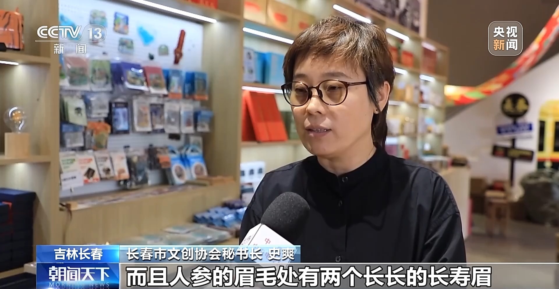 長春市文創(chuàng)協(xié)會秘書長 史爽:因?yàn)槲覀兗质∈侨藚⒌闹饕a(chǎn)地,上面的紅圍脖結(jié)合了我們原有的人參典故,系紅繩的這樣的一個(gè)典故,而且人參的這眉毛處有兩條長長的長壽眉,象征著吉祥如意。