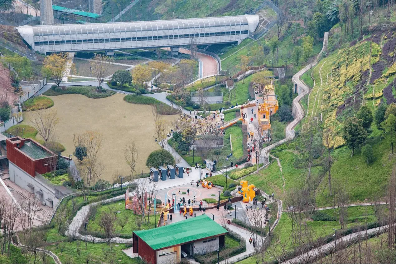 依山就勢,渝中區(qū)推進(jìn)21萬平方米坡坎崖由“禿斑”變“綠毯”、由“荒地”變“游園”、由“治理點(diǎn)”變“打卡點(diǎn)”。實(shí)現(xiàn)了鵝嶺—虎頭巖10.8公里山脊線綠蔭如蓋,長江、嘉陵江11.5公里濱水綠帶織綠成廊。渝中在紅巖公園充分利用“漏斗”地形,擋墻加固崖壁緩坡,生態(tài)復(fù)綠4.35萬平方米,中間平坦區(qū)域開辟為兒童樂園,入選全國兒童友好空間典型案例。